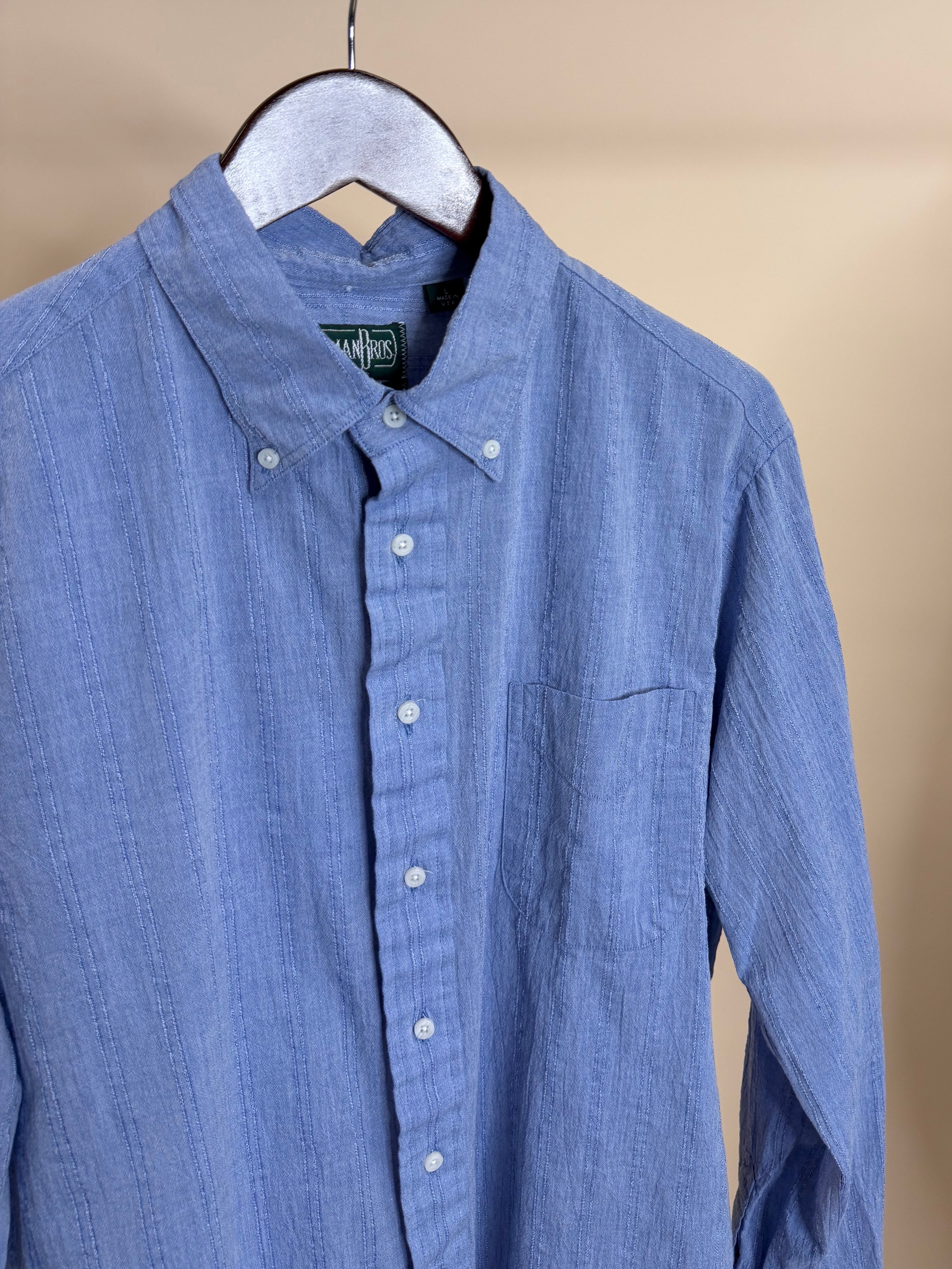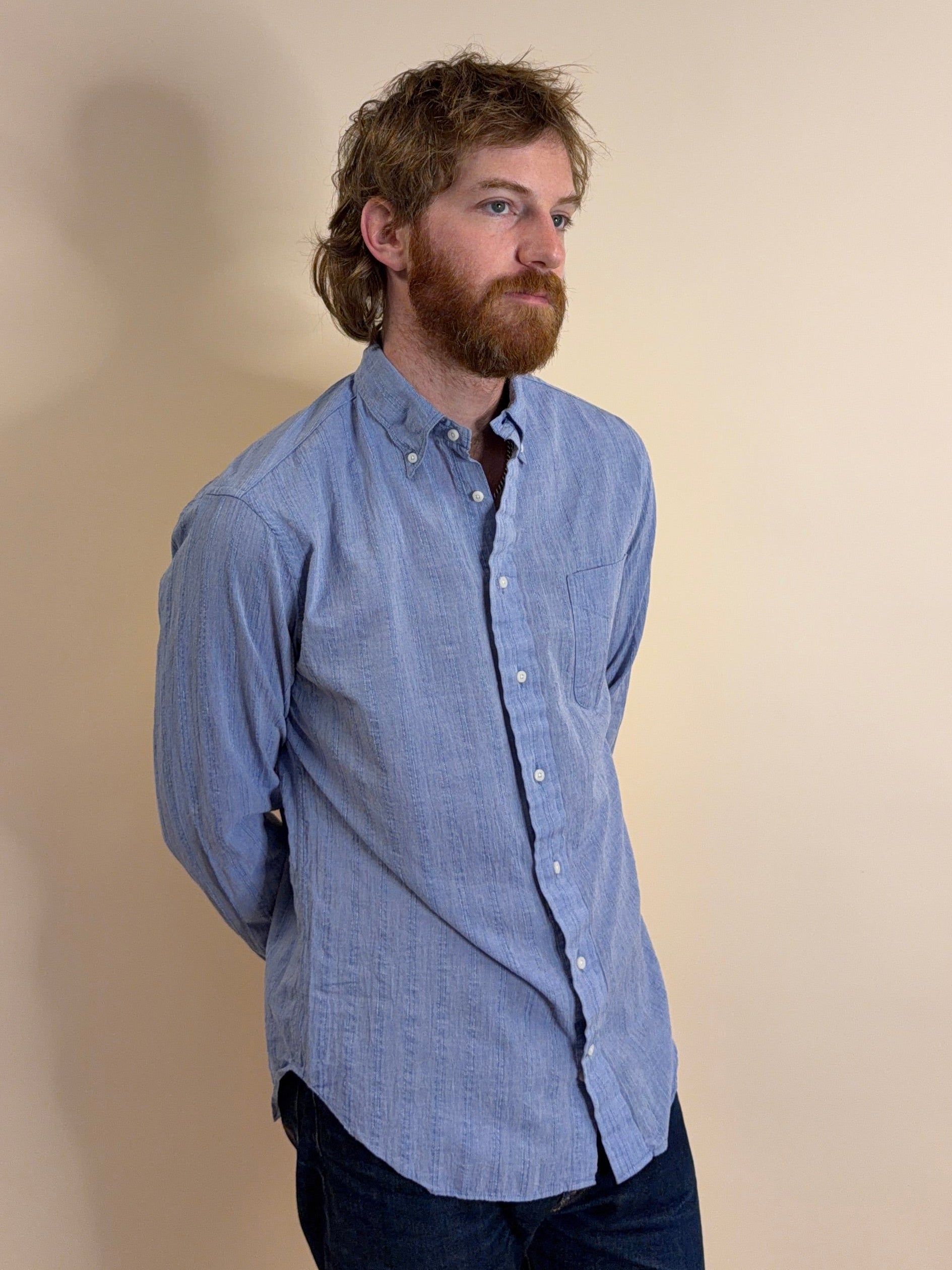 Where traditional ticking stripes can feel buttoned-up and old world, this version leans easy and casual. Breathable, slightly beachy, and built for warm days, it has the kind of texture that feels good on skin and only gets better with wear.