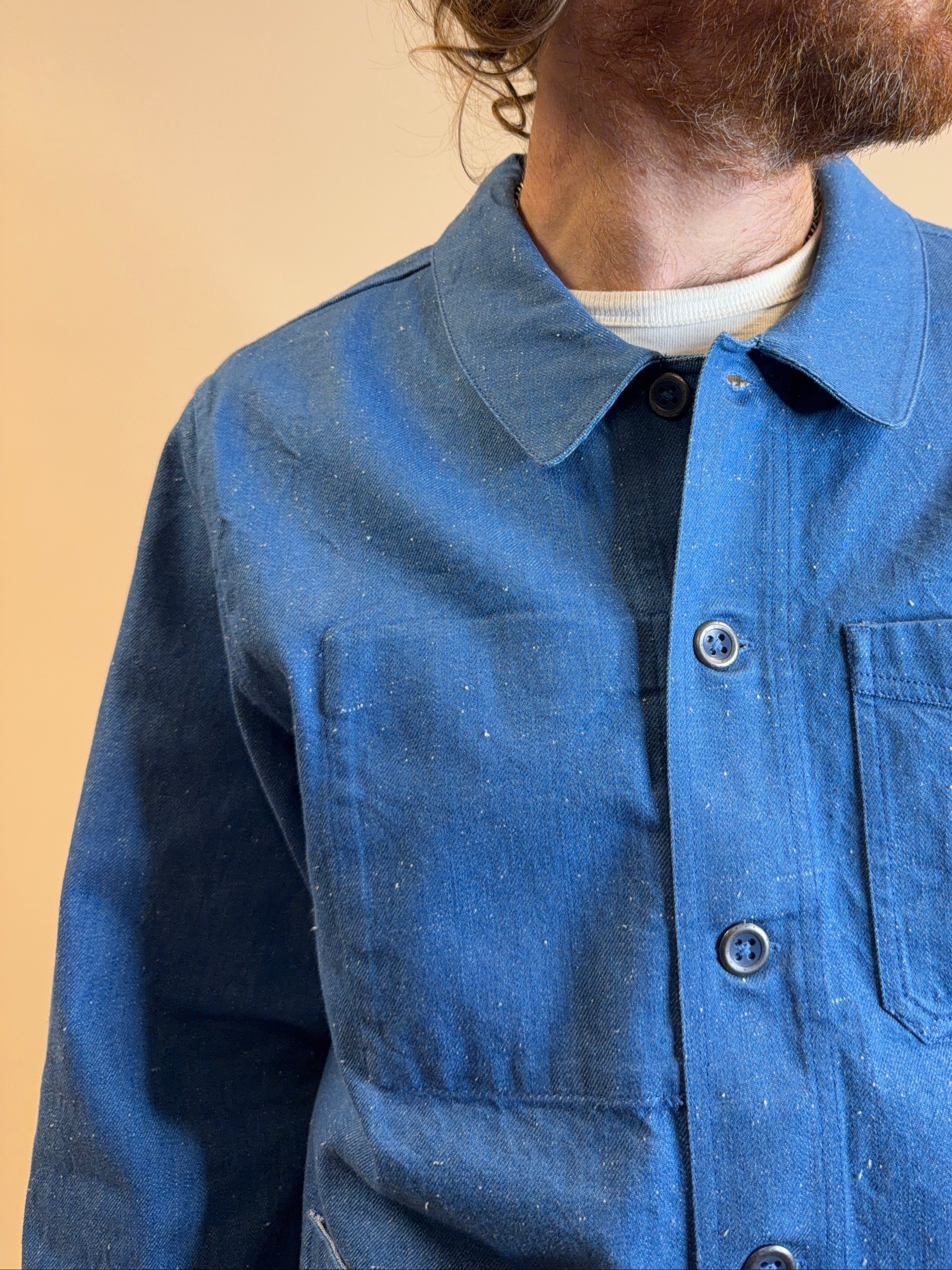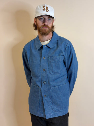 The fabric is a mid weight Japanese denim woven with highly neppy, light indigo yarns that give the jacket depth and texture from the start, with even more character developing over time. Built for daily wear and long-term use.