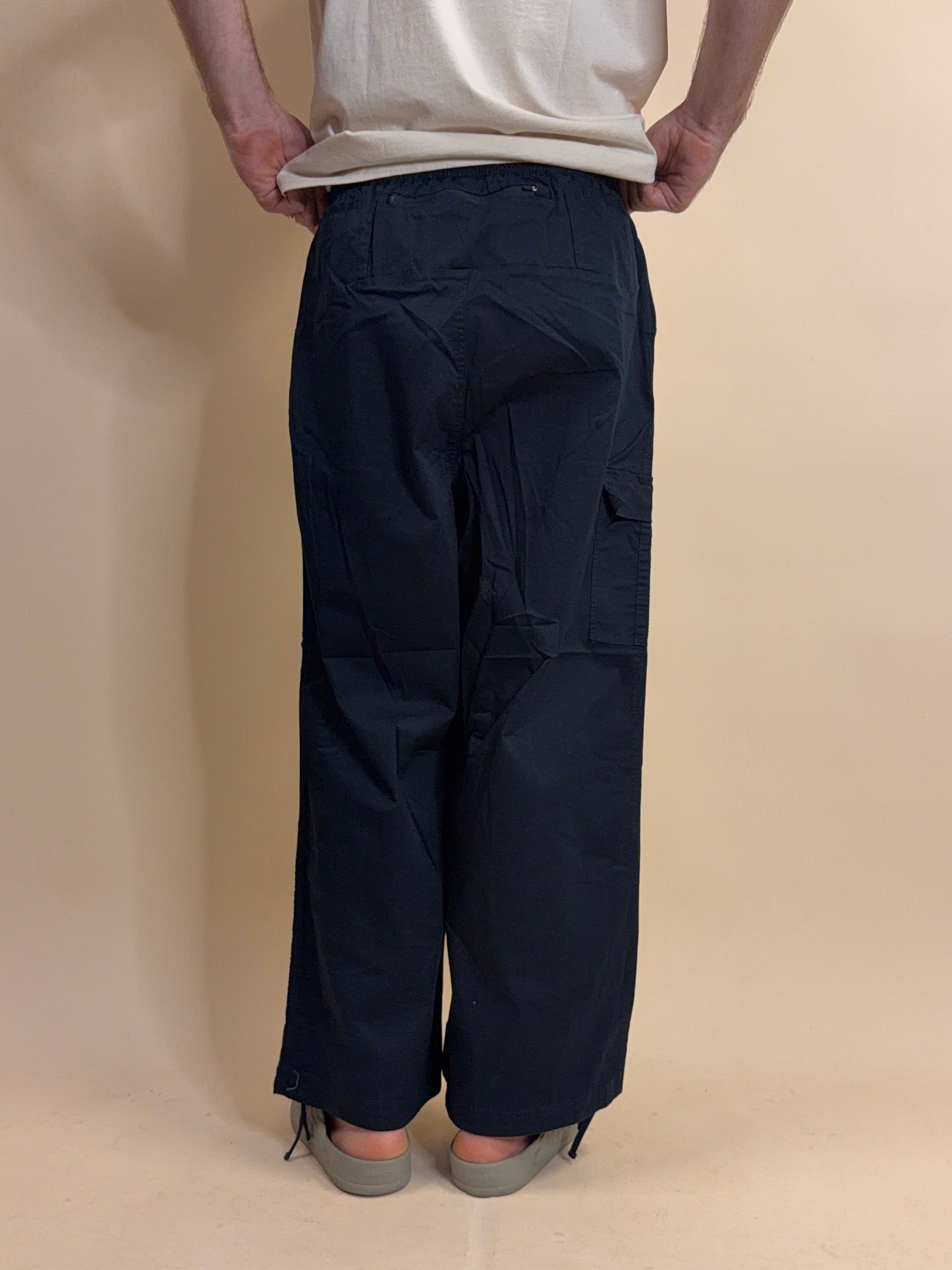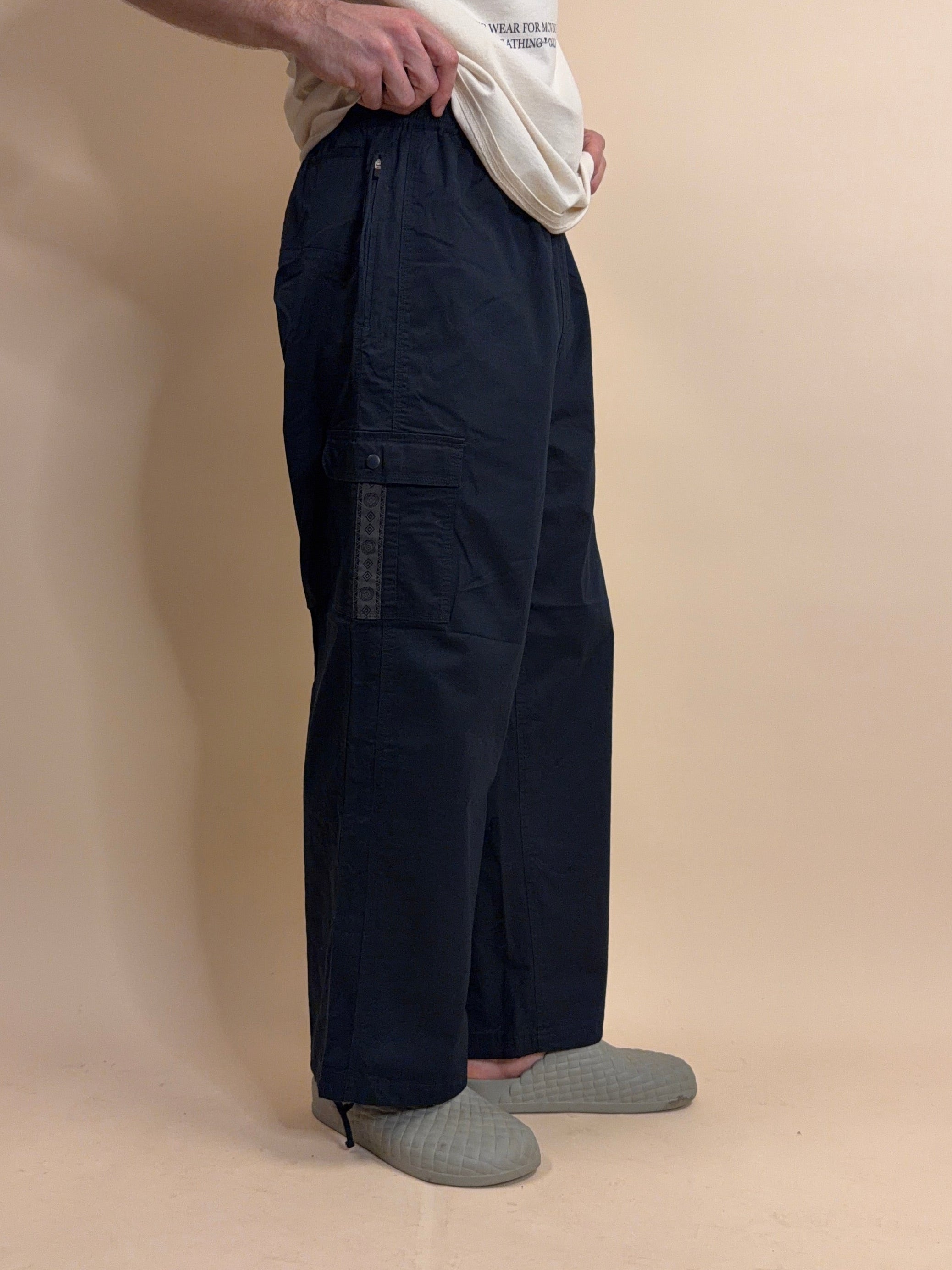 The baggy fit sport pant designed for movement and comfort. With single side cargo pocket, center back phone size zip pocket, two back slip pockets. Elastic waist band with drawstring and cinch at ankle opening. With asymetrical custom grey with pop green icon webbing down leg.