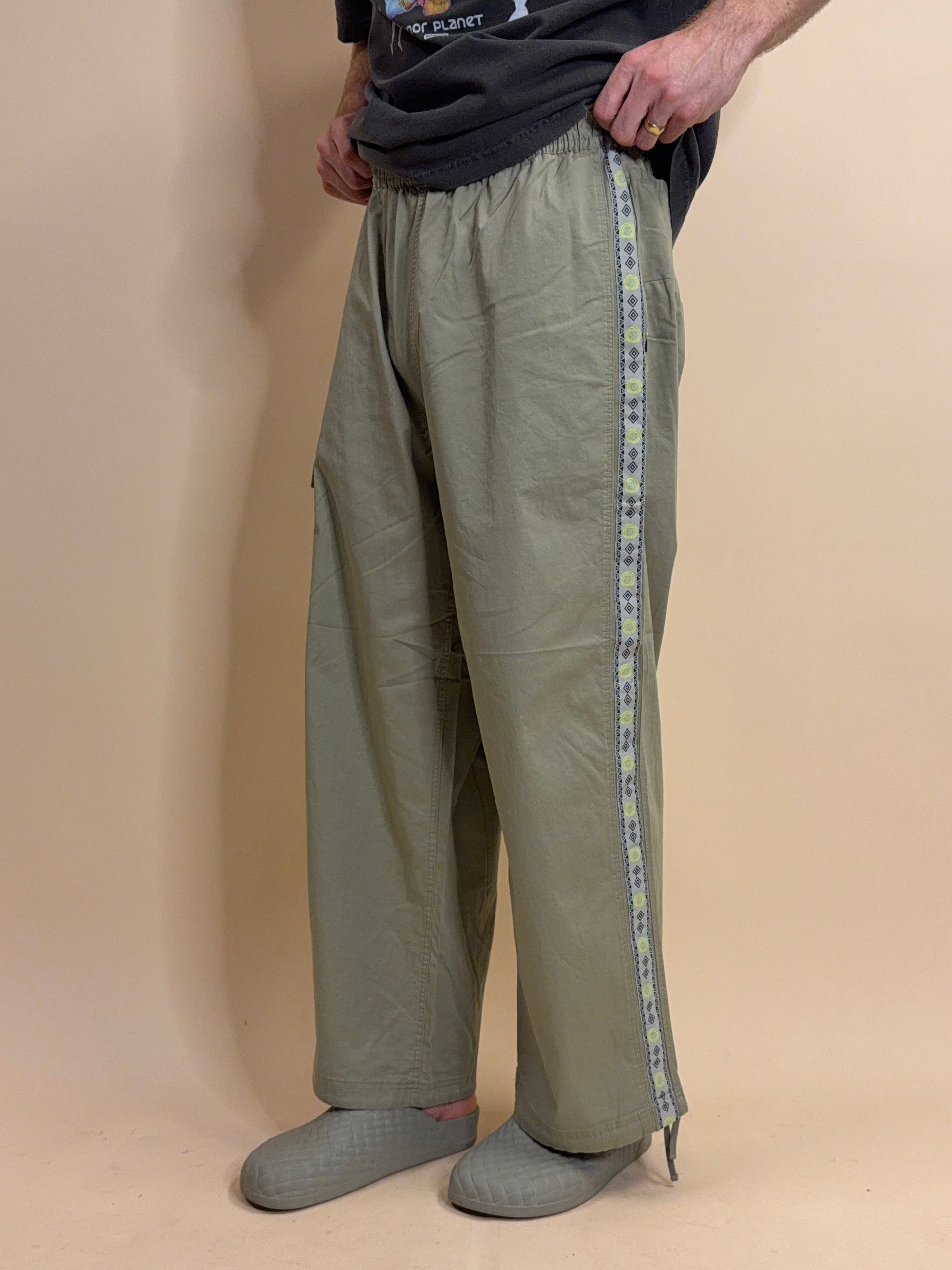 The baggy fit sport pant designed for movement and comfort. With single side cargo pocket, center back phone size zip pocket, two back slip pockets. Elastic waist band with drawstring and cinch at ankle opening. With asymetrical custom grey with pop green icon webbing down leg.