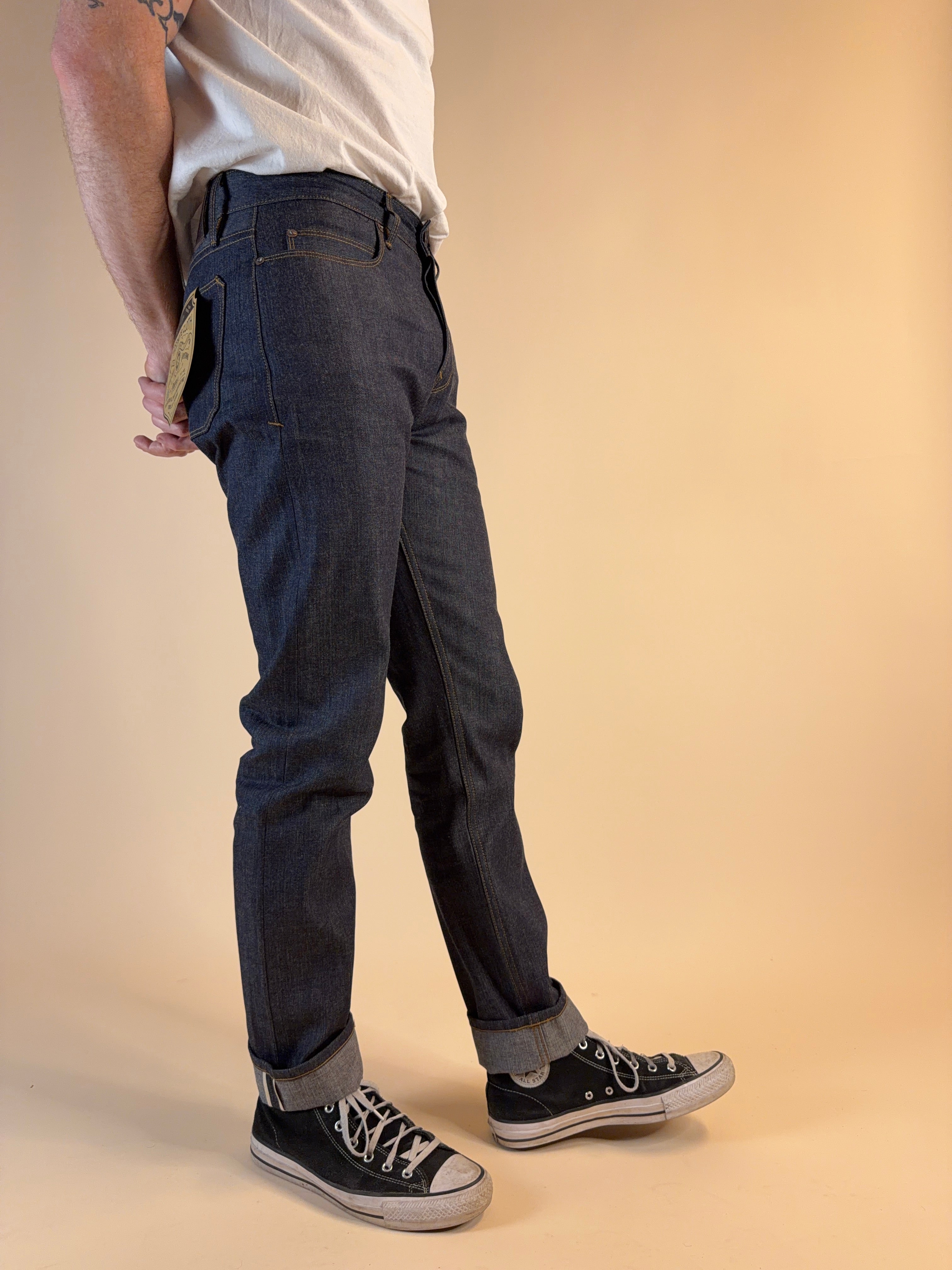 - Custom 11 ounce reproduction selvedge denim from Japan