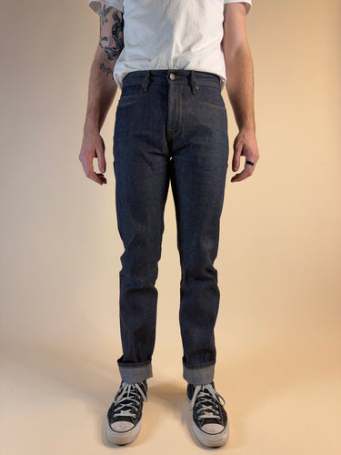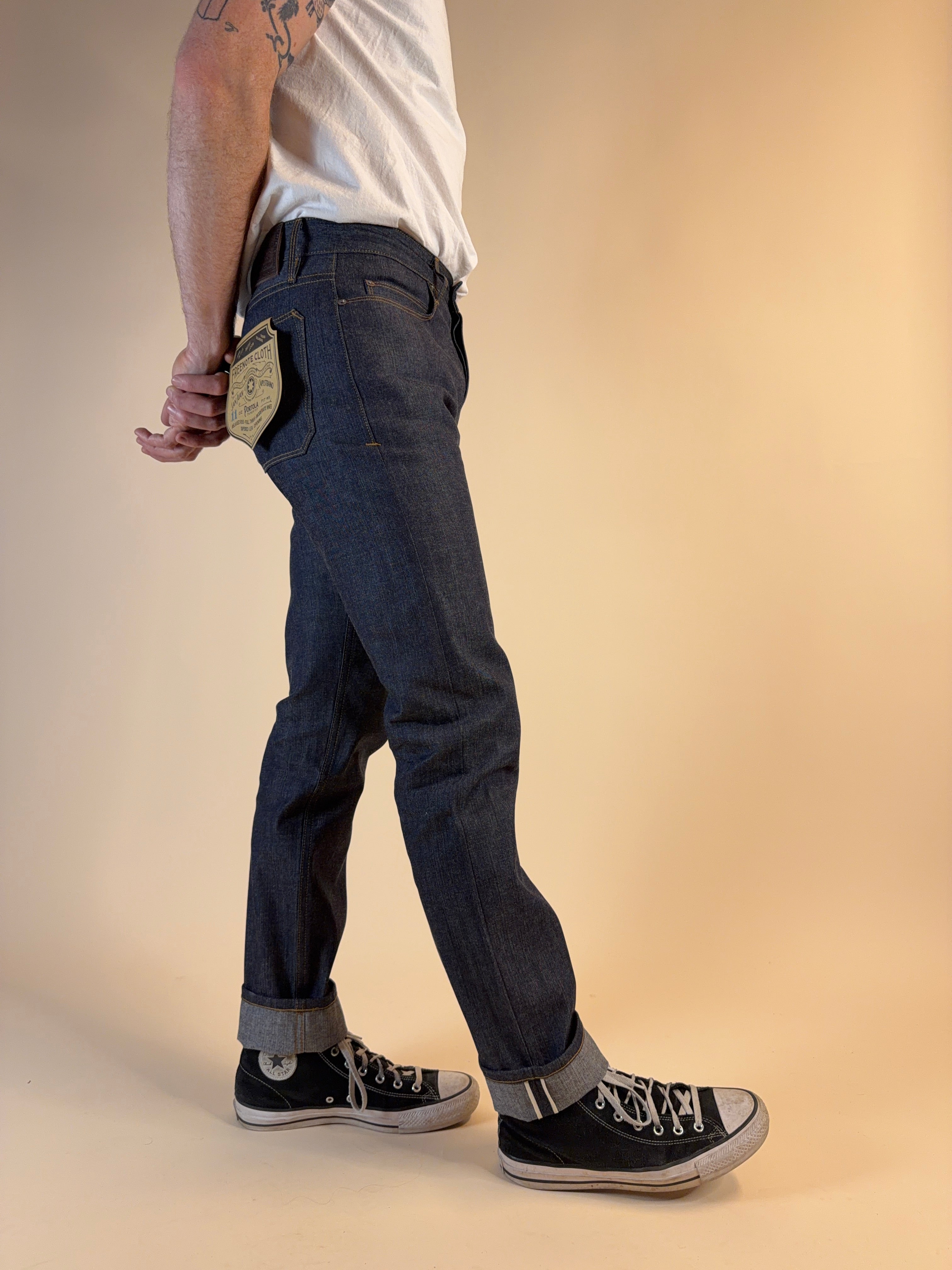 One of our most popular cuts the Portola, classic tapered, in a nice 11oz lightweight denim. A little space in the thigh, a nice taper. Classic cut that never goes out of style. Relaxed rise.